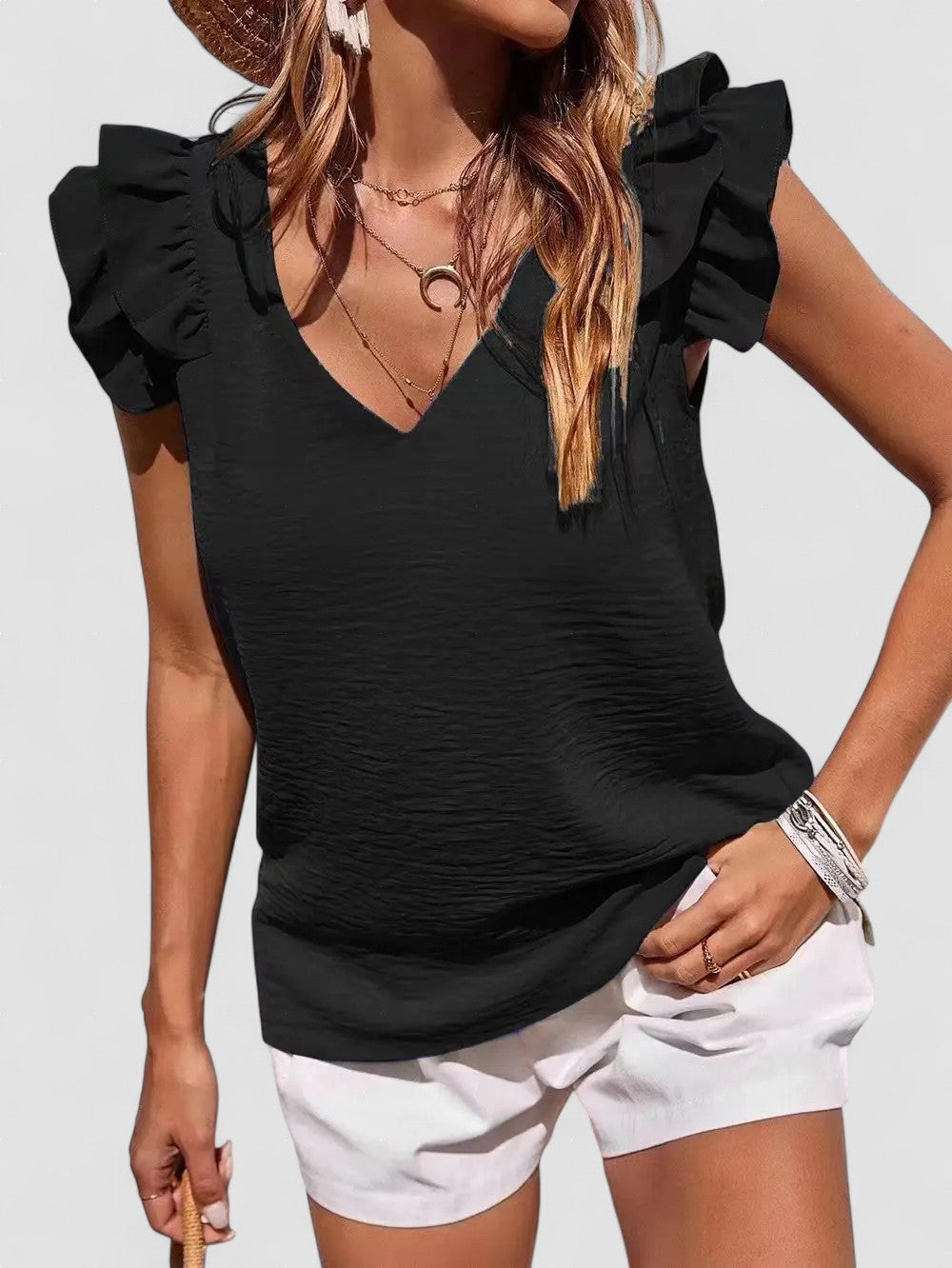 Top lejer cu detalii feminine - Lynette combină confortul și stilul fără efort. Cu un material ușor, decolteu în V și mâneci jucăușe cu volane, este alegerea perfectă pentru orice ocazie.